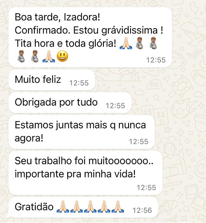 Comecei há 2 meses a terapia com a Izadora. Estava muito angustiada e ansiosa, iniciando o processo de FIV. A cada sessão com ela eu sentia meu coração se acalmando, a ansiedade dando lugar à confiança e à esperança e agora sinto que estou totalmente preparada para a minha primeira implantação. Recomendo muito.